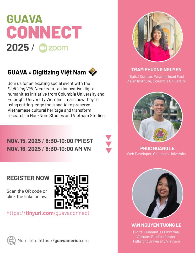 - [GUAVA] Join us for an exciting social event GUAVA Connect 2025 with the Digitizing Việt Nam team—an innovative digital humanities initiative from Columbia University and Fulbright University Vietnam. Learn how they’re using cutting-edge tools and AI to preserve Vietnamese cultural heritage and transform research in Han-Nom Studies and Vietnam Studies. Register to attend: https://tinyurl.com/guavaconnect